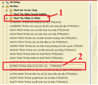 Vào mục “Thuế Thu Nhập Cá Nhân” => Bấm chọn “06/TNCN tờ khai khấu trừ từ CNV, CK… (TT80/2021)”