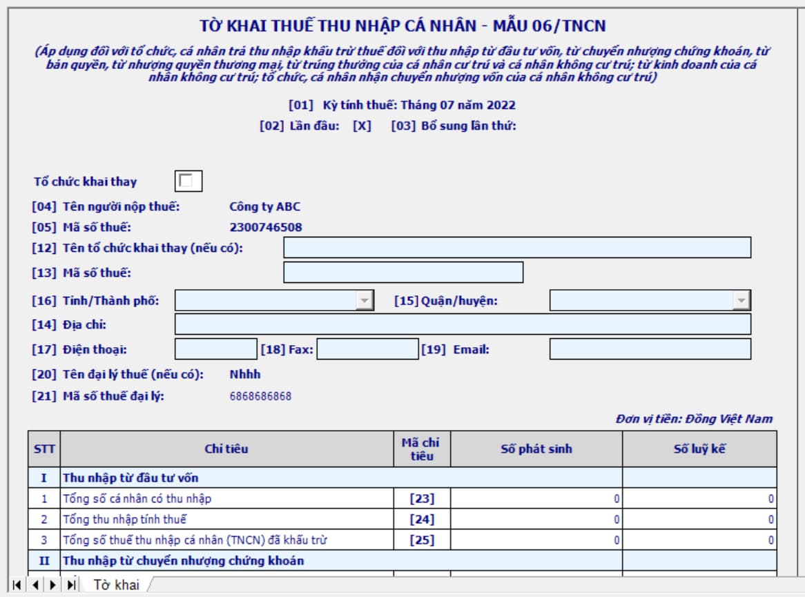 1. Mẫu tờ khai 06/TNCN trên phần mềm HTKK: