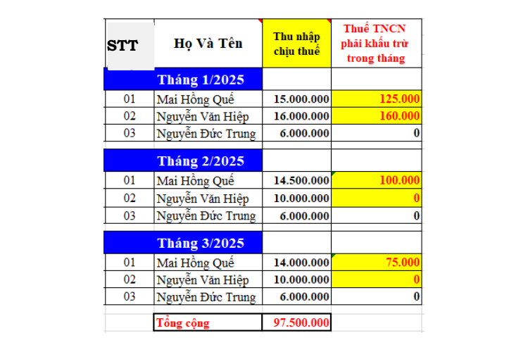 Ví dụ: Trong quý 1 năm 2025, công ty Bảo An có trả lương cho 3 nhân viên như sau: